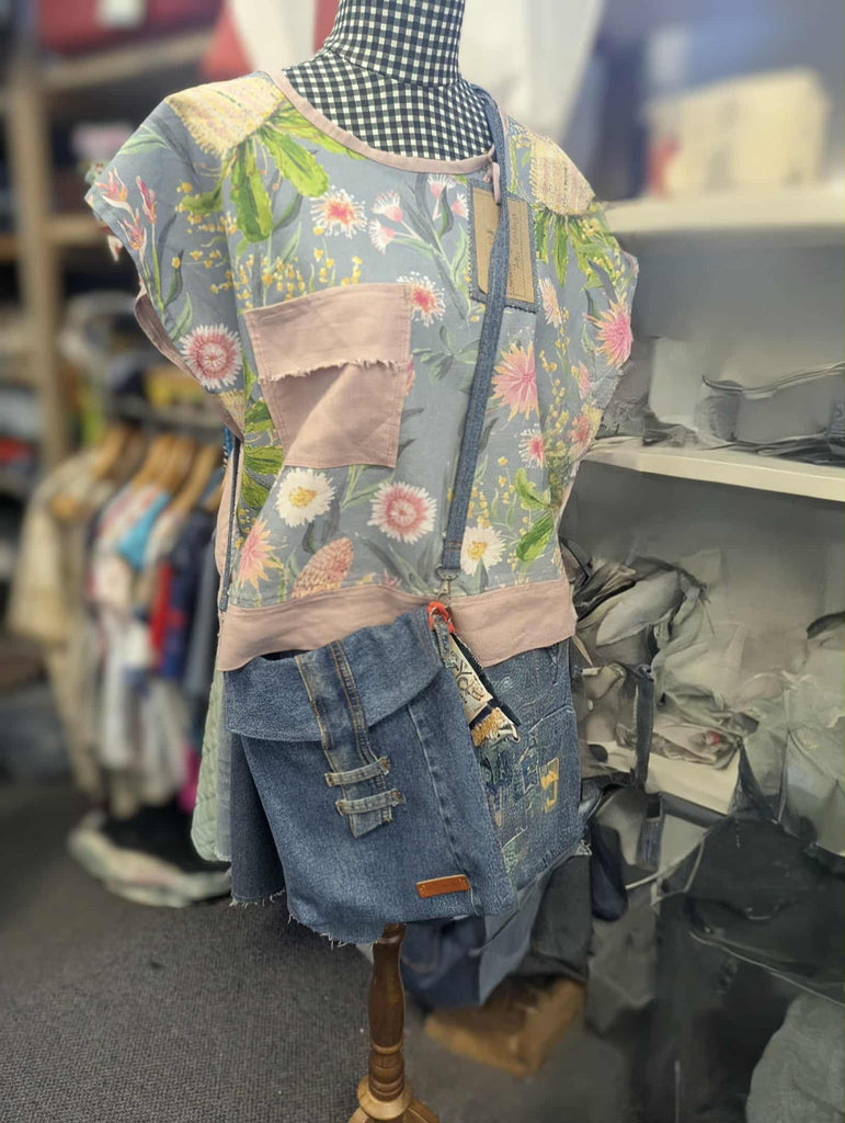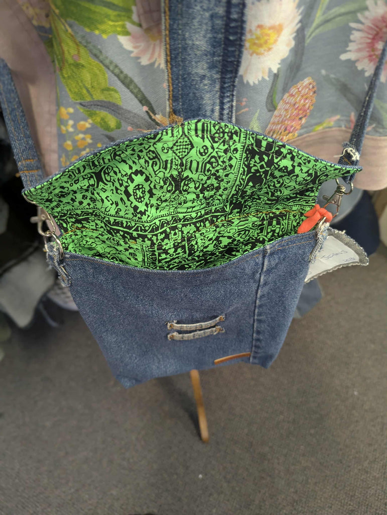 An upcycled denim shoulder or cross-body bag, created from jeans and lined with discarded fabric.